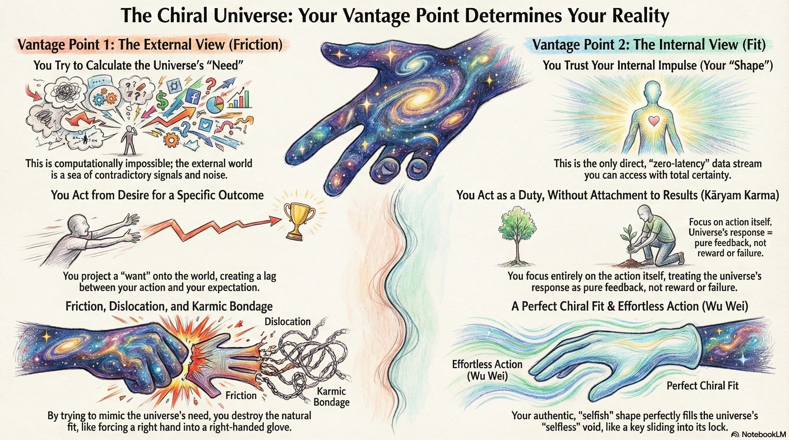 By treating the External World not as a vending machine for desires but as a mirror for calibration, the "Selfish" act of the individual becomes perfectly tuned to the "Need" of the collective. The Microcosm processes the Macrocosm's data, and the Chiral Fit is achieved.